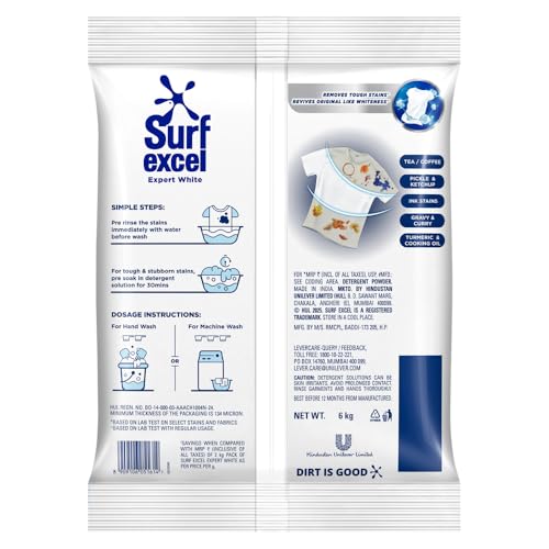 Introducing for the first time – Surf Excel Expert White, a revolutionary breakthrough in fabric care, specially formulated to bring your dull, faded white garments back to life. Powered by advanced Active Oxygen Technology, this new-age detergent doesn’t just clean — it transforms. It’s designed to deliver a superior laundry experience that goes well beyond ordinary stain removal. Whether it’s stubborn tea spills, ink marks, or the daily grime from commuting and outdoor activities, Surf Excel Expert White tackles even the toughest stains with ease. But that’s not all. White clothes, over time, tend to lose their brightness and develop a dull or yellowish tint — a common problem with regular detergents. This innovative formula penetrates deep into the fabric to lift out dullness and eliminate yellowness, restoring your clothes to a bright, radiant, almost-new whiteness. Perfect for school uniforms, office shirts, festive whites, baby clothes, and even delicate garments, this detergent is both powerful and gentle. It ensures your whites not only look immaculately clean but also feel fresh, soft, and comfortable after every wash. Make a smart switch to Surf Excel Expert White — for laundry that truly reflects your high standards. Say goodbye to faded, tired-looking whites and hello to long-lasting brilliance. Try the all-new Surf Excel Expert White today and see the expert difference for yourself!